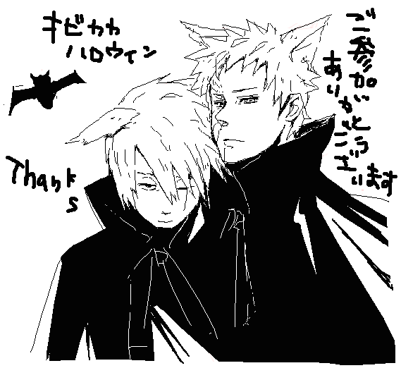 なんだろ…カカシが好きで単品けもカカも良いんだけど、オビトさんとセットだとぐっとカカシの可愛さ増してる気がして、はぅあッ!ってなるんですよね…絵茶なのにリアルタイムで感想吐き出せなかったのでここで長々書いてしまいましたが、みなさまハロウィンオビカカごちそうさまでした!!